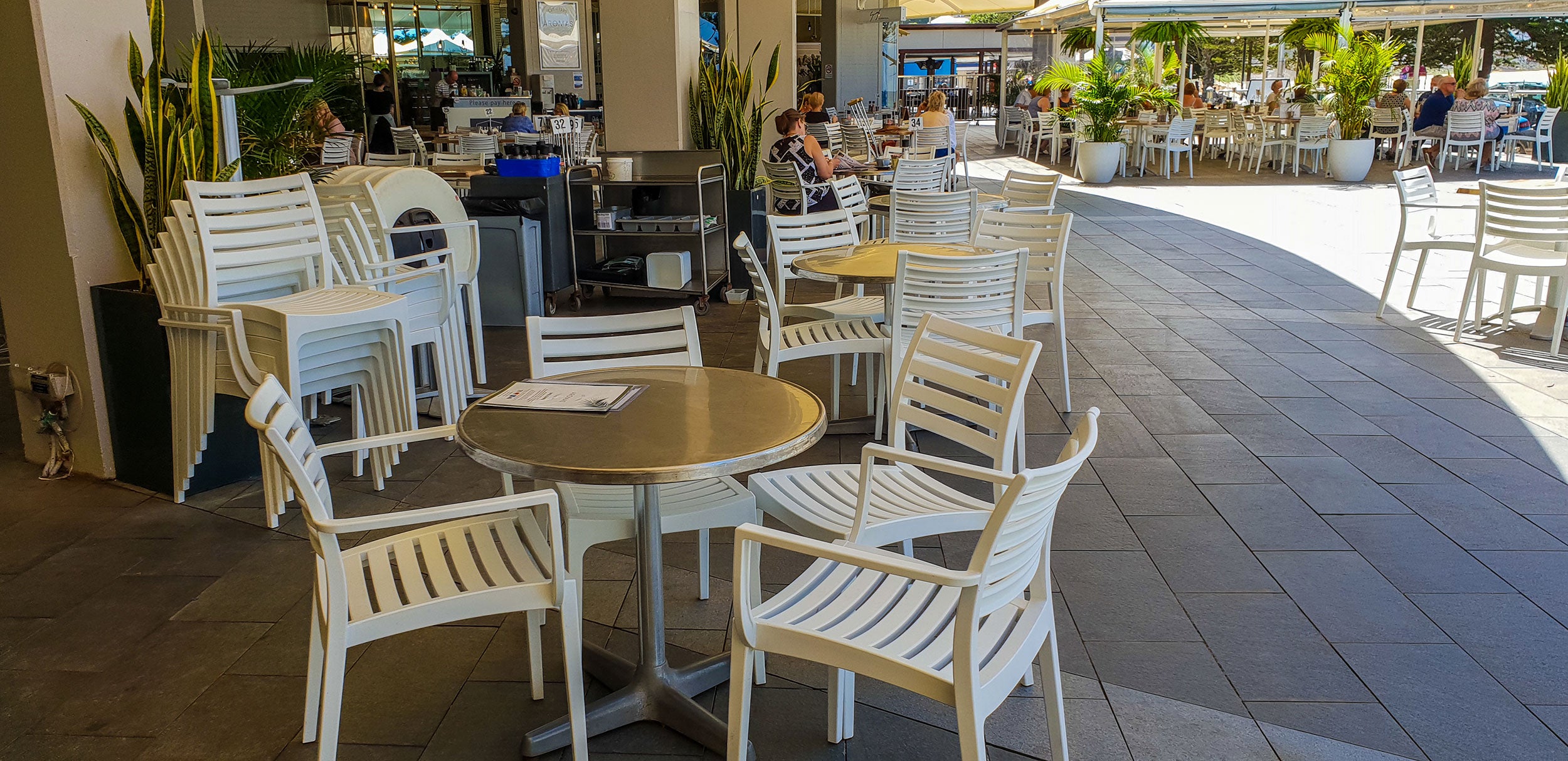 Aromas on Sea has a massive outdoor dining area that overlooks the ocean. To complement the views and mediterranean feel we provided White Artemis and Ares Chairs which were matched with our Shesman Duratops.