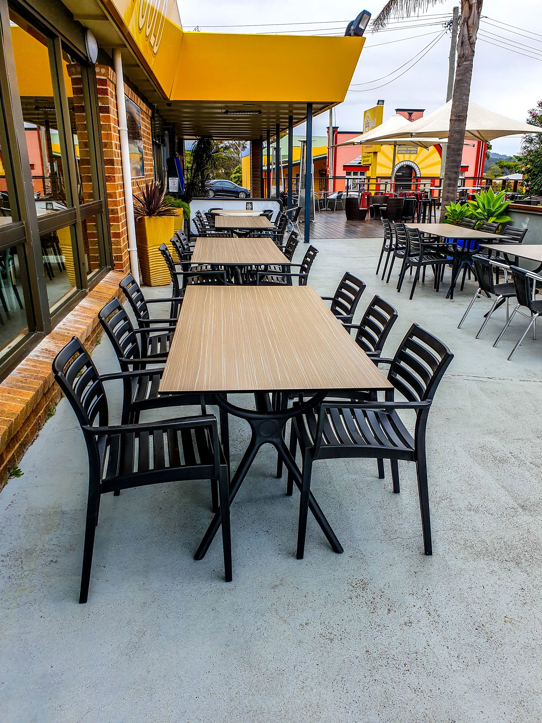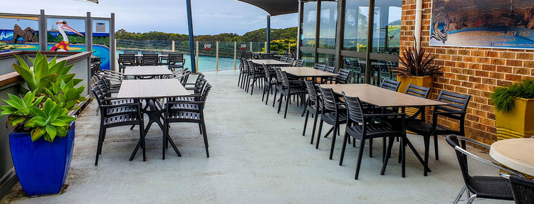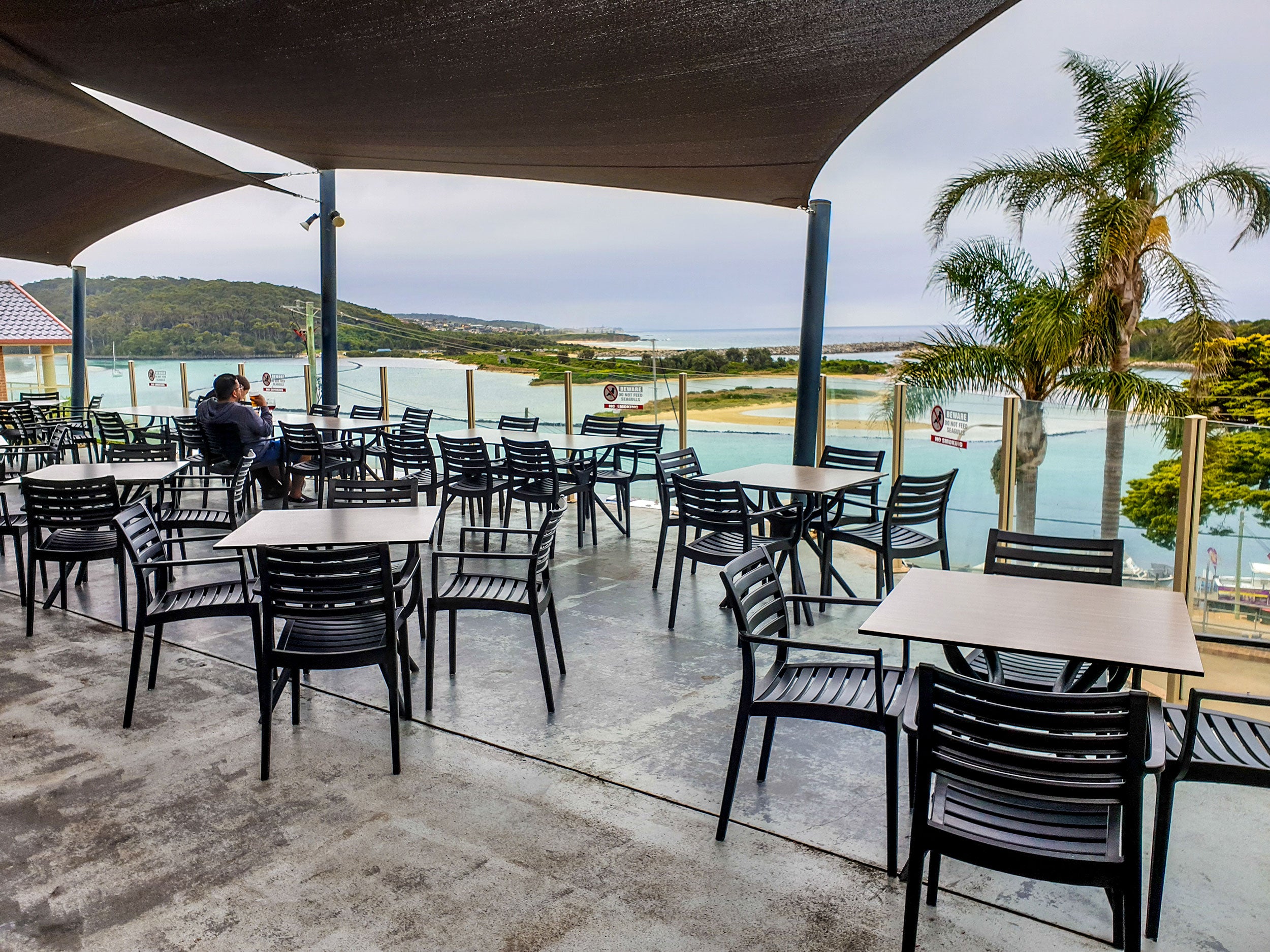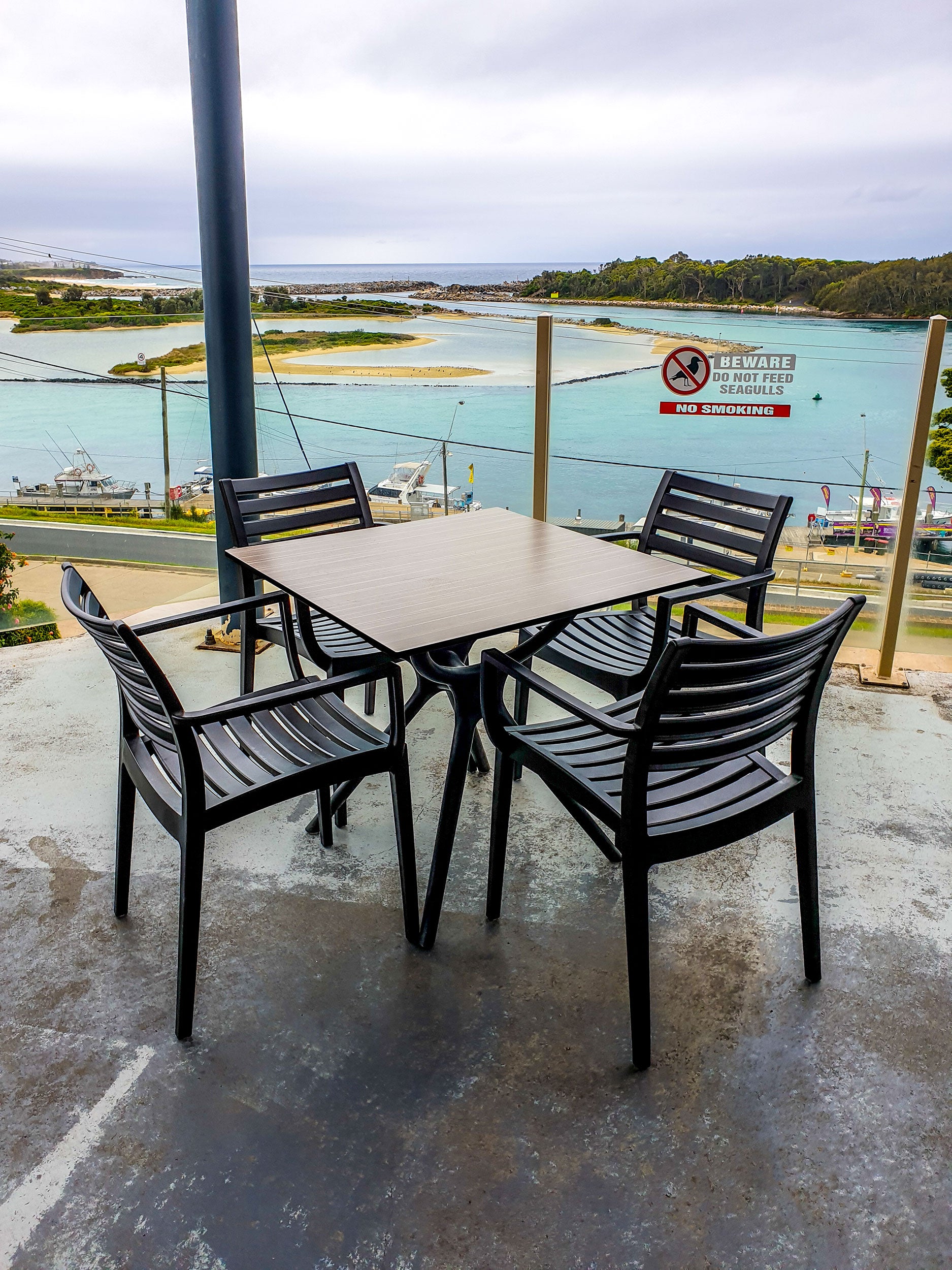 Perched on the rise of Campbell St in Narooma is the Narooma Hotel. Enjoying breathtaking views of the Wagonga Inlet looking out to Wagonga Head and the Pacific Ocean the Hotel is known for its million dollar views. Featuring a large outdoor dining area featuring black Artemis Armchairs black Air Legs and Compact Laminate Table Tops you can enjoy a meal while taking in the views, place a bet in the sports bar or simply enjoy a cold one after a hard days work.