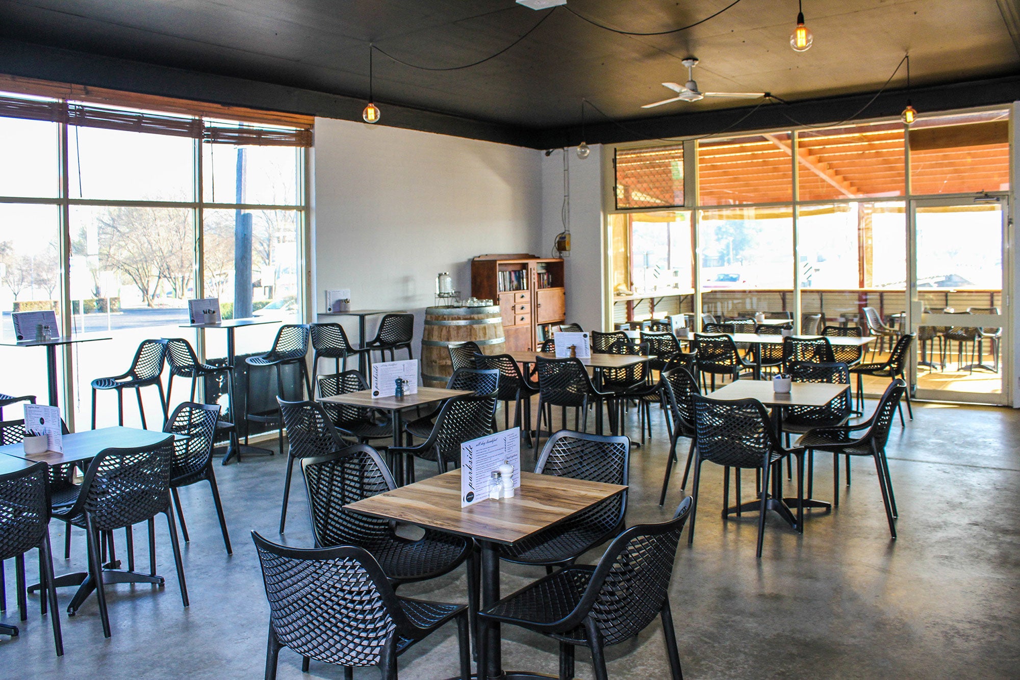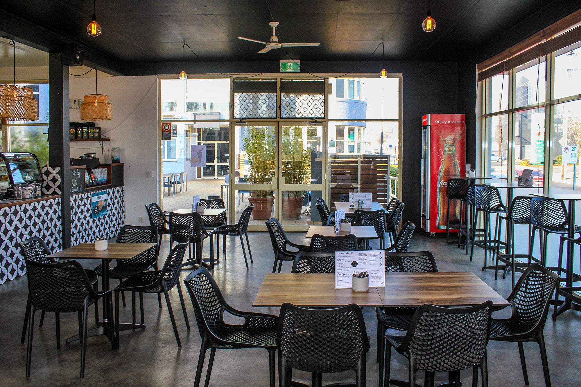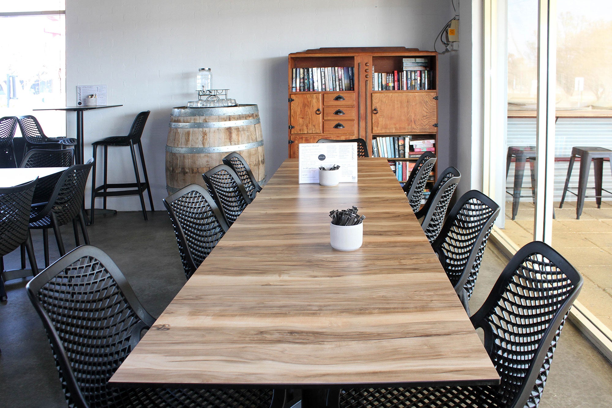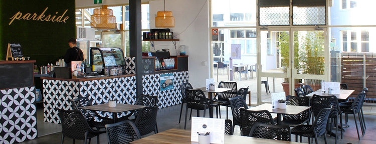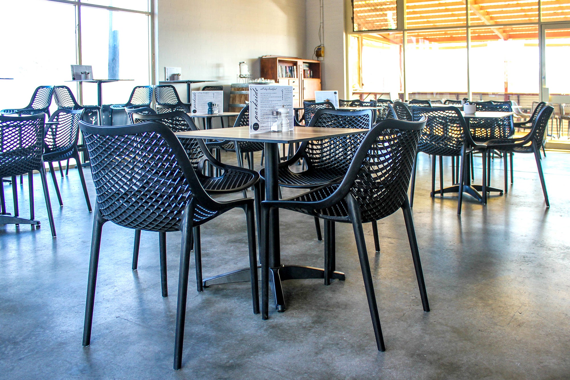 With the cafe having a modern eco look interior the furnishings had to compliment the style. Black air chairs and barstools were selected for seating. These comfortable chairs look great in the environment and are not overly stated to allow the surrounds to be the hero. Combined with Black Astoria Bases the Shesman Table tops used throughout the cafe add a wood element to the table settings carrying the eco feel throughout the dining space.