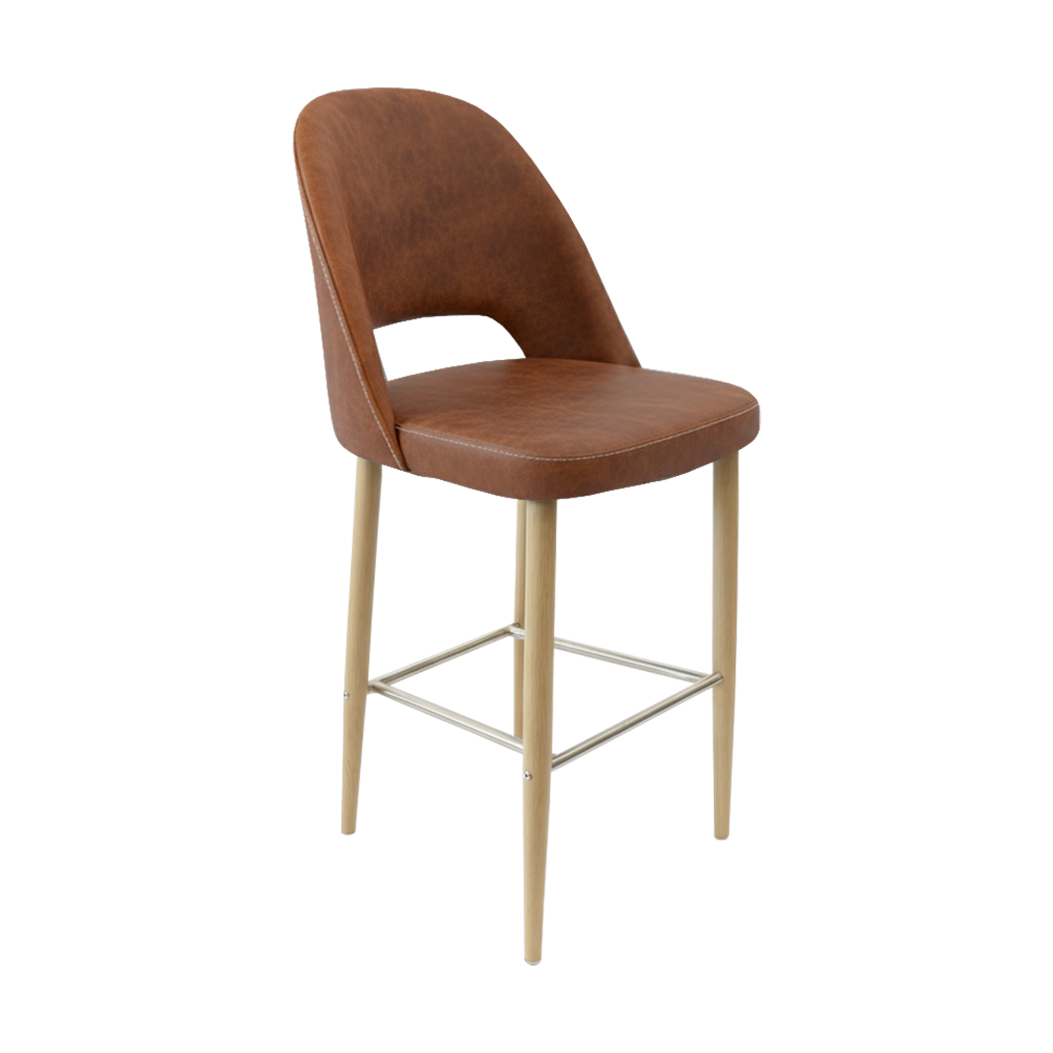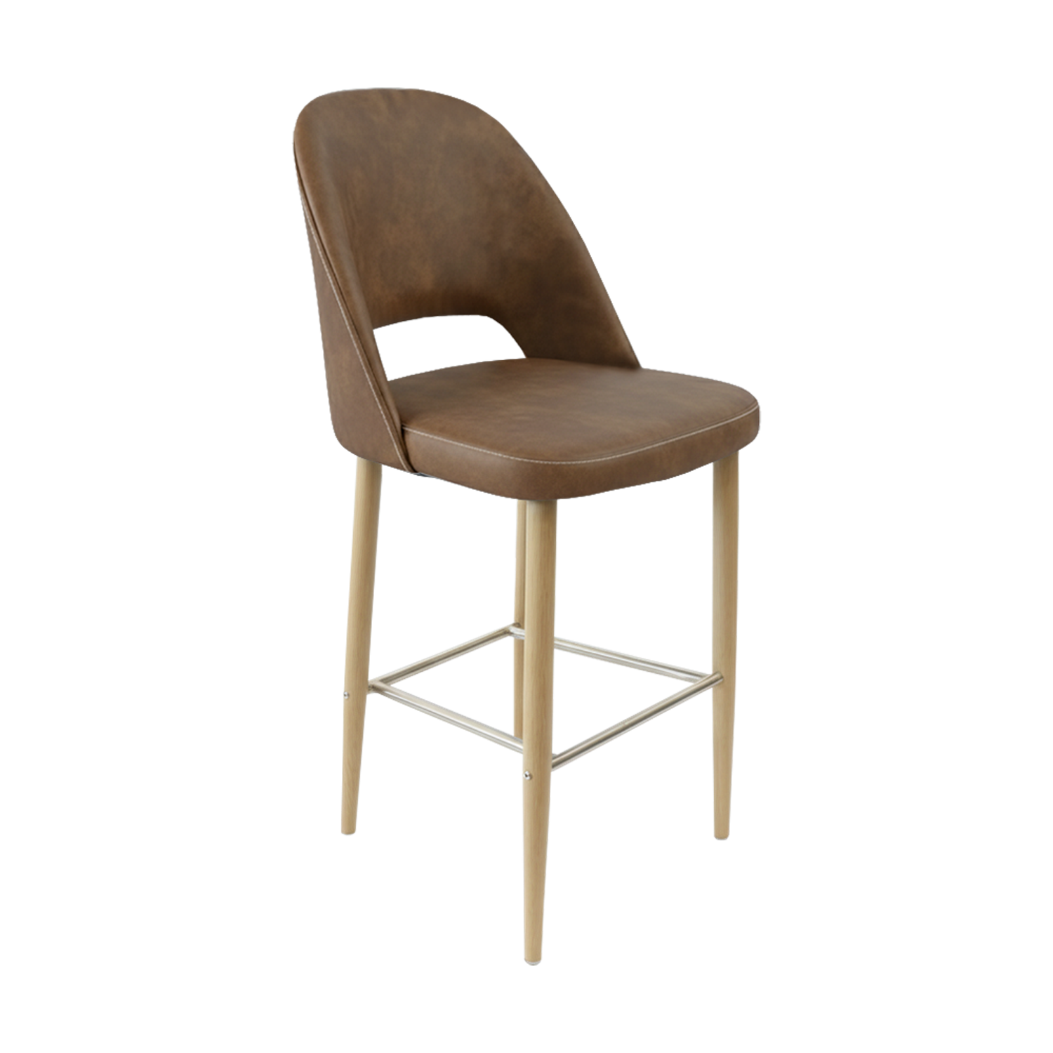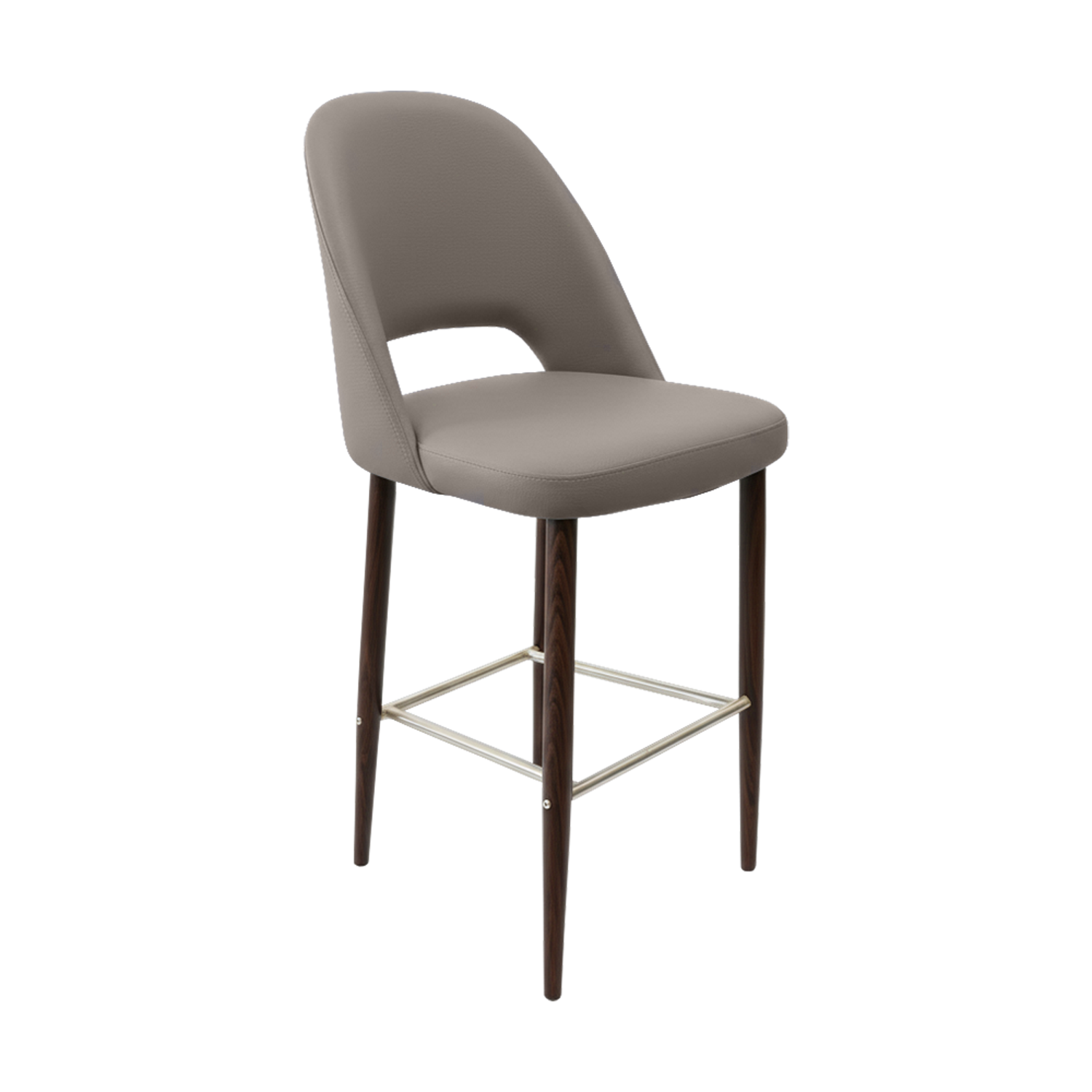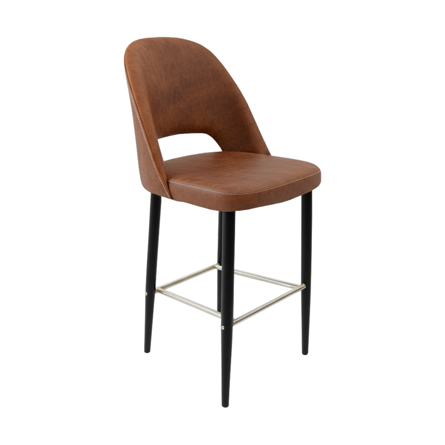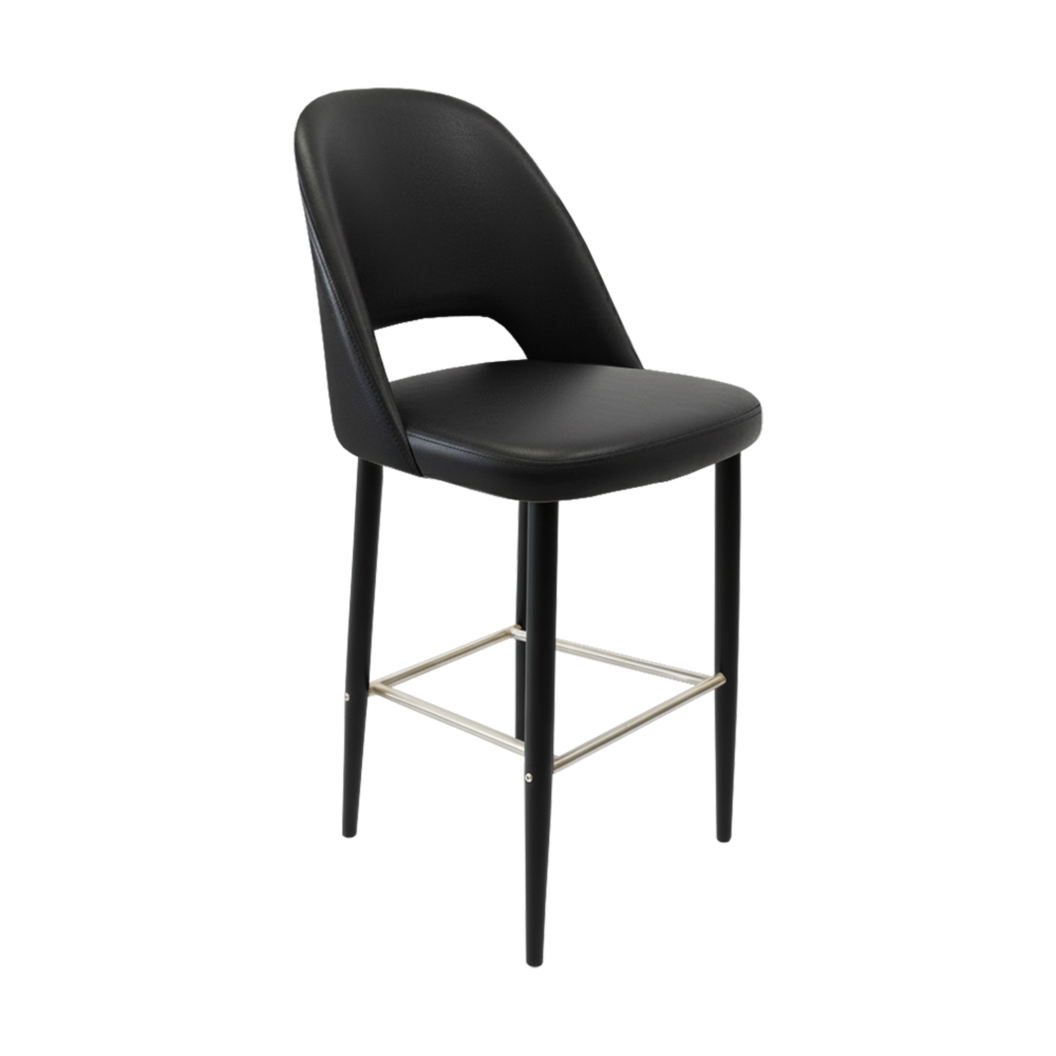 The polished stainless steel footrest adds a refined touch while offering ergonomic support for guests seated at bar-height counters or communal tables. The seat is padded with high-density commercial foam, delivering superior comfort that lasts through breakfast rushes, lunch crowds, and evening service.